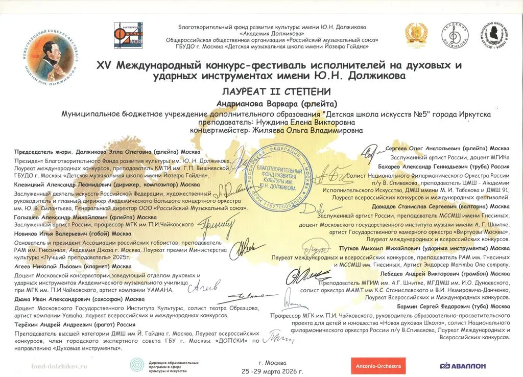 29 марта 2026 г. закончился V Международный конкурс-фестиваль исполнителей на духовых и ударных инструментах имени Ю.Н. Должикова. Конкурс длился несколько месяцев, начиная с отборочных туров в 35 городах России и ближнего Зарубежья, во вновь присоединенных территориях Российской Федерации, и завершился финальными состязаниями в столице России, в ГБУДО г. Москвы ДМШ им Й. Гайдна.