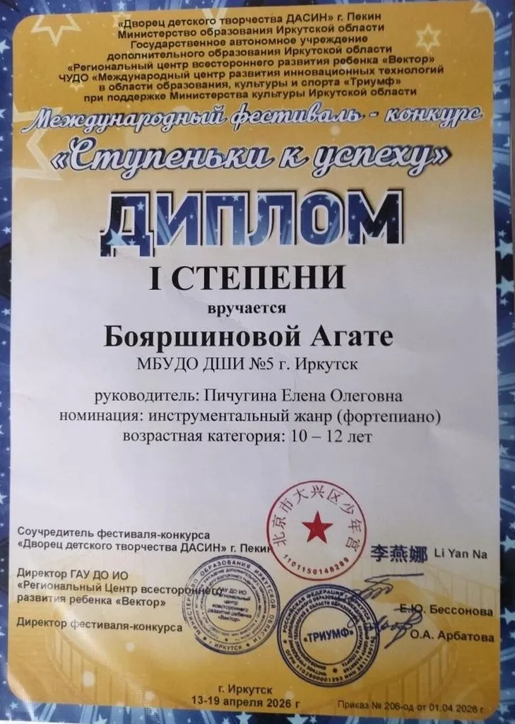 ДИПЛОМАНТ I степени – Бояршинова Агата, 4 класс, преподаватель Пичугина Е.О.